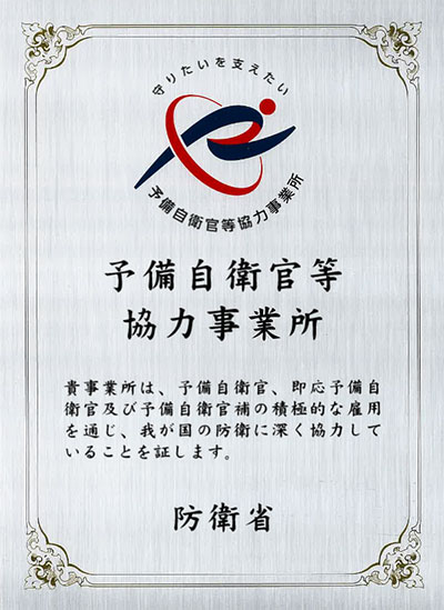 | 令和5年2月 | 予備自衛官等協力事業所に認定 |