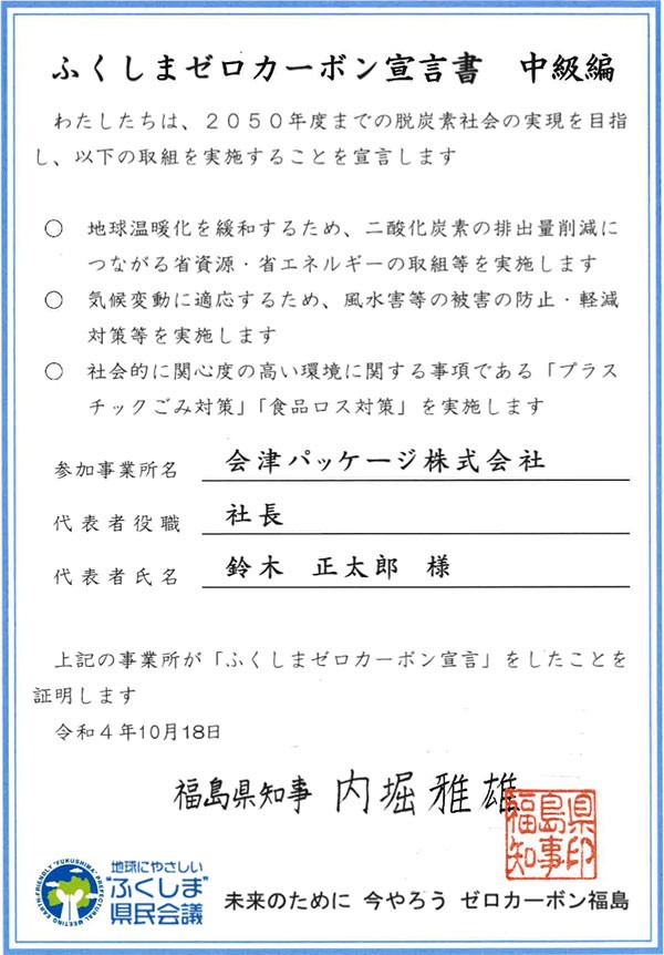 | 昭和55年6月 | 新社名に組織変更し、会津パッケージ株式会社設立 資本金4000万 代表取締役社長として、鈴木 正博が就任 |